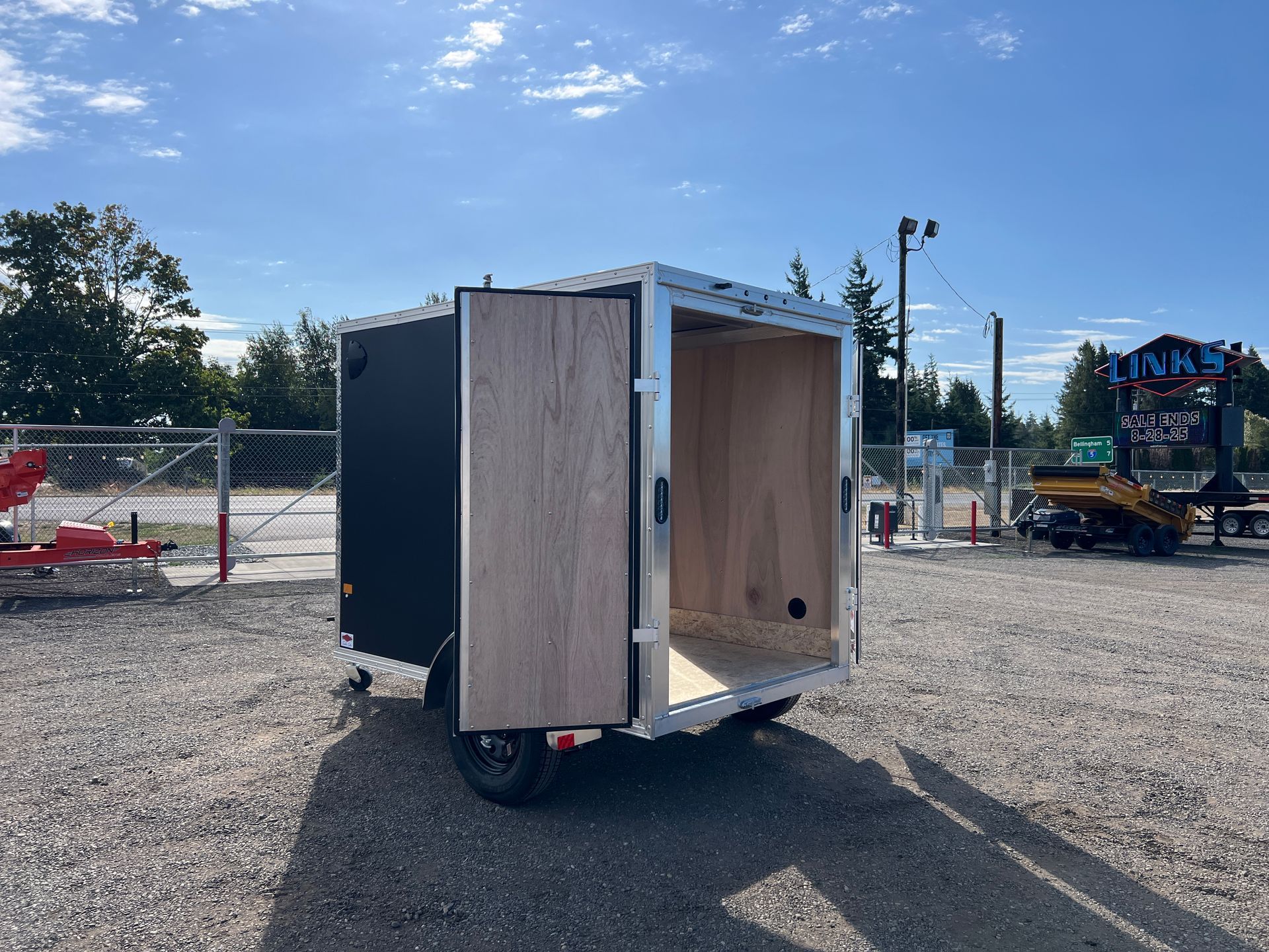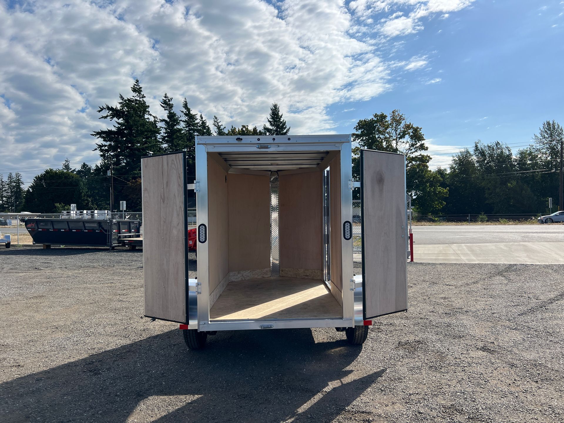 Rear Double Barn Doors, Side Door, 6" Extra Height, One Piece Aluminum Roof, V-Nose Construction, 24" Stone Guard, 1200# Wheel Jack, Plastic Salem Vents, Interior Dome Light, Wood Luan Walls w/ Kick Plate, Interior Cove Trim