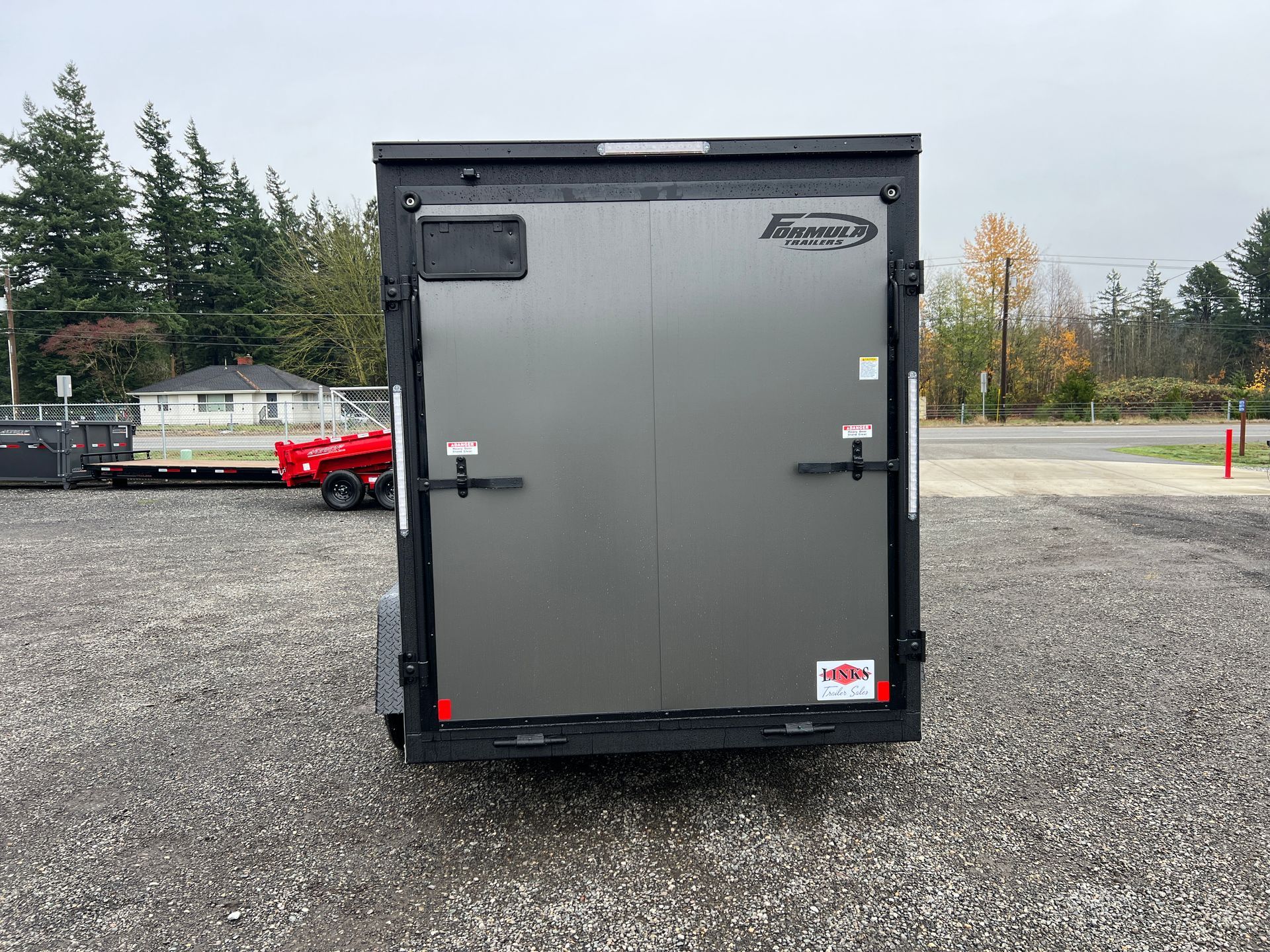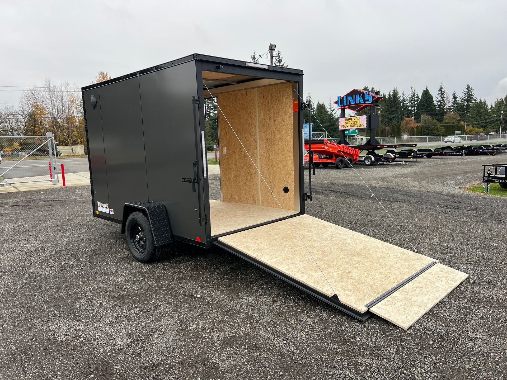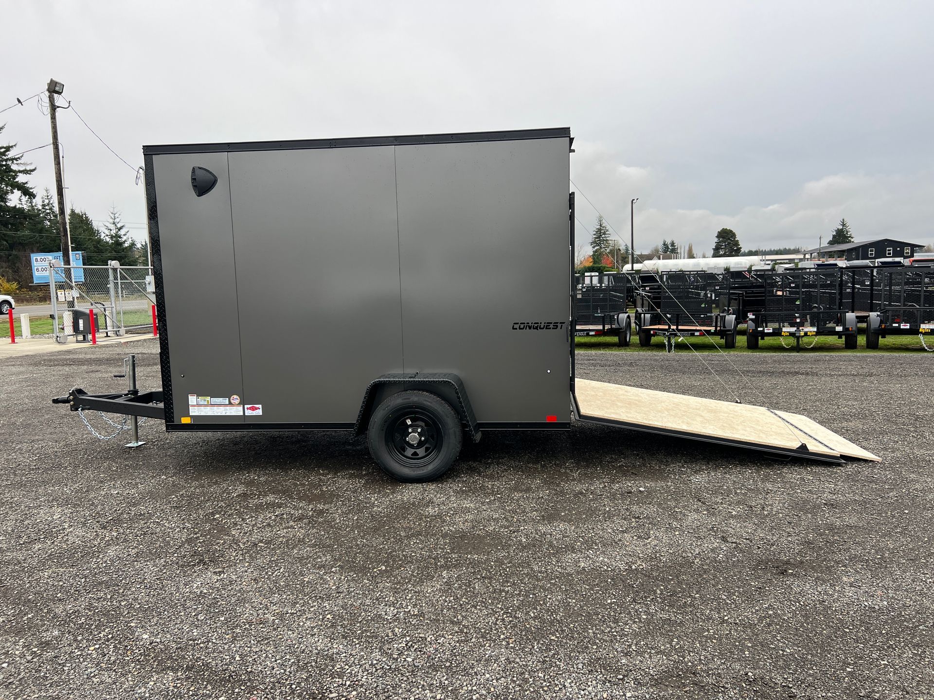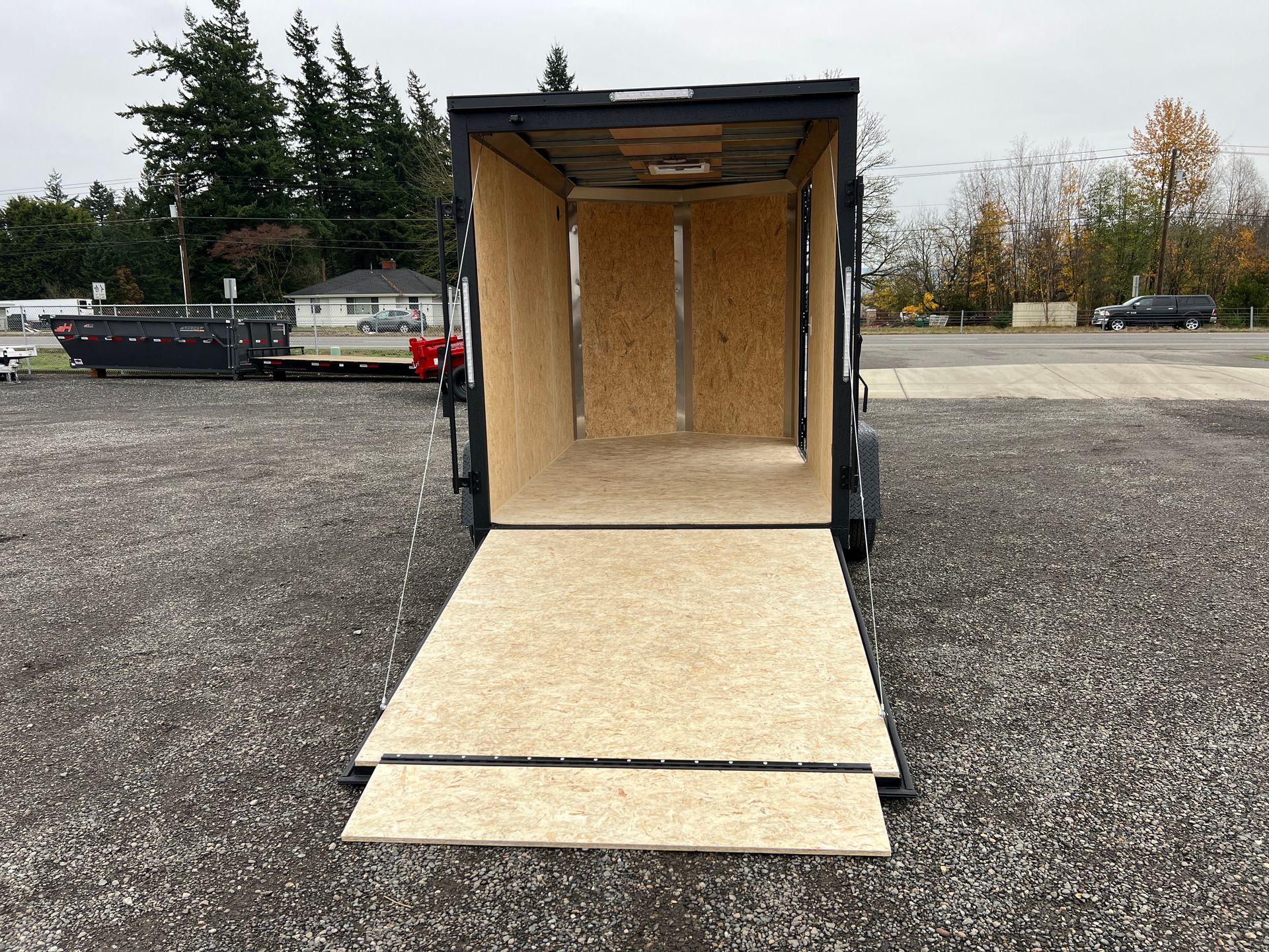Rear Ramp Door w/ Assist, 12" Ramp Extension, Side Door, 6" Extra Height, Upgraded to Composite Exterior, Aluminum Treadplate Fenders, Roof Vent, Plastic Flow Thru Sidewall Vents, 2K Set-Back Tongue Jack, Interior LED Dome Light w/ Switch
