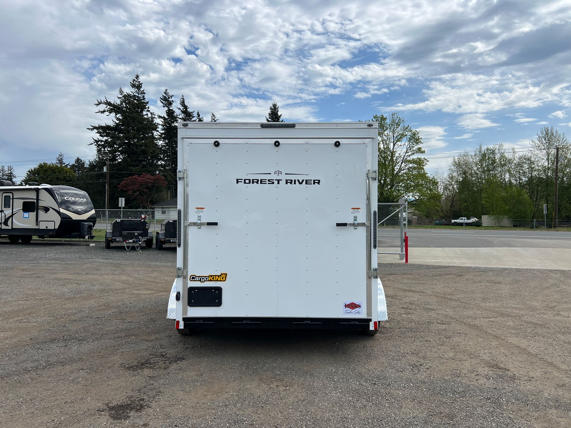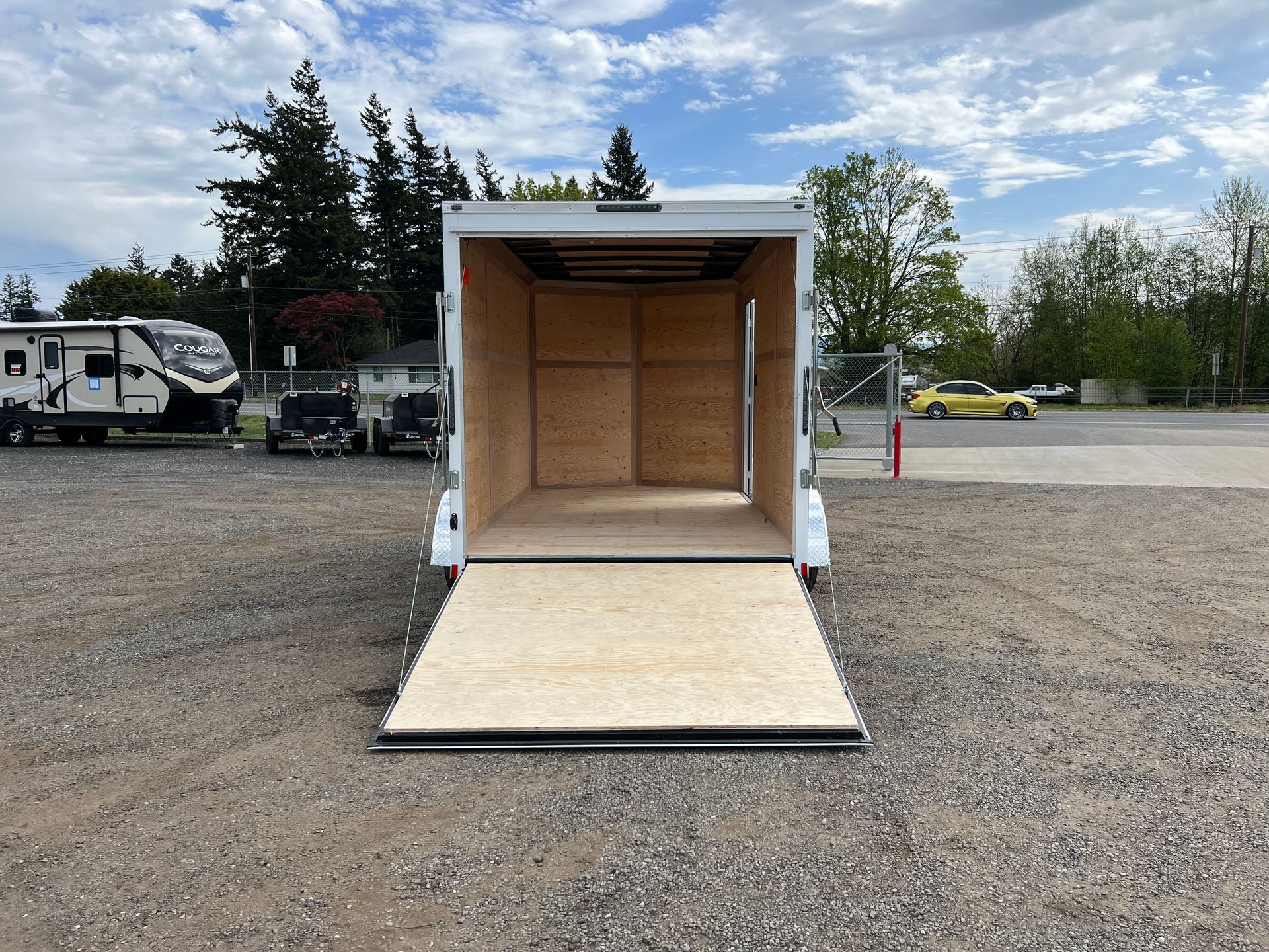 Rear Ramp Door, Upgraded 36" RV Side Door, 6" Extra Height, 24" Aluminum Tread Plate Stoneguard, Dome Light w/ Switch, Pair of Stabilizer Jacks